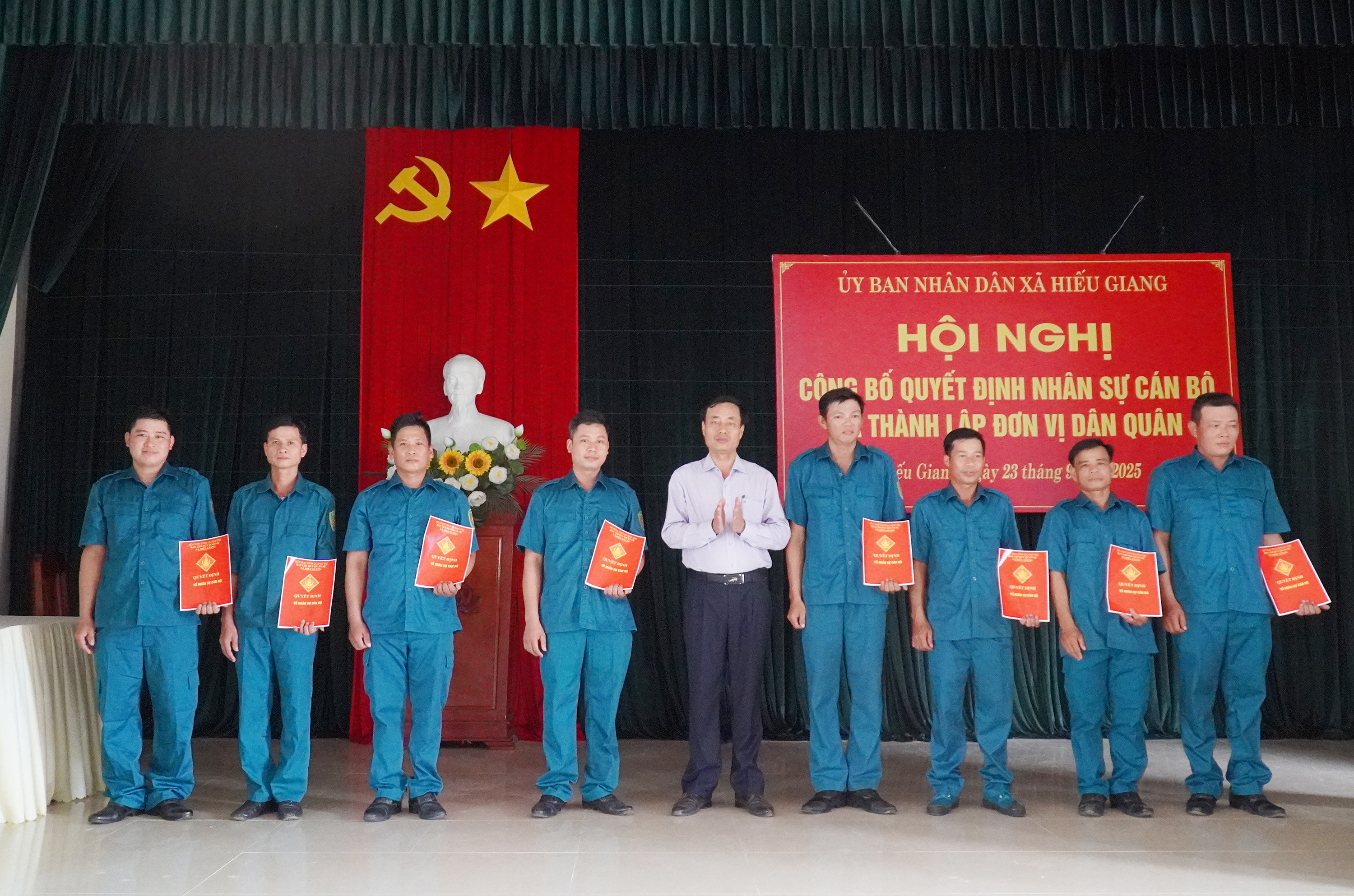 Chiều 23/9/2025, UBND xã Hiếu Giang tổ chức hội nghị công bố quyết định nhân sự cán bộ và thành lập đơn vị dân quân. Dự hội nghị có đồng chí Đại tá Đặng Thái Toàn, Phó Chỉ huy trưởng Ban Chỉ huy Phòng thủ khu vực 4 – Triệu Phong; đồng chí Nguyễn Thị Thanh Hương, Bí thư Đảng ủy, Chủ tịch HĐND xã; đồng chí Nguyễn Thanh Bắc, Phó Bí thư Đảng ủy, Chủ tịch UBND xã.