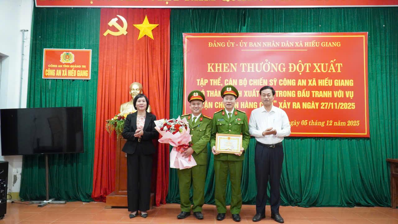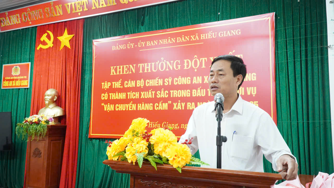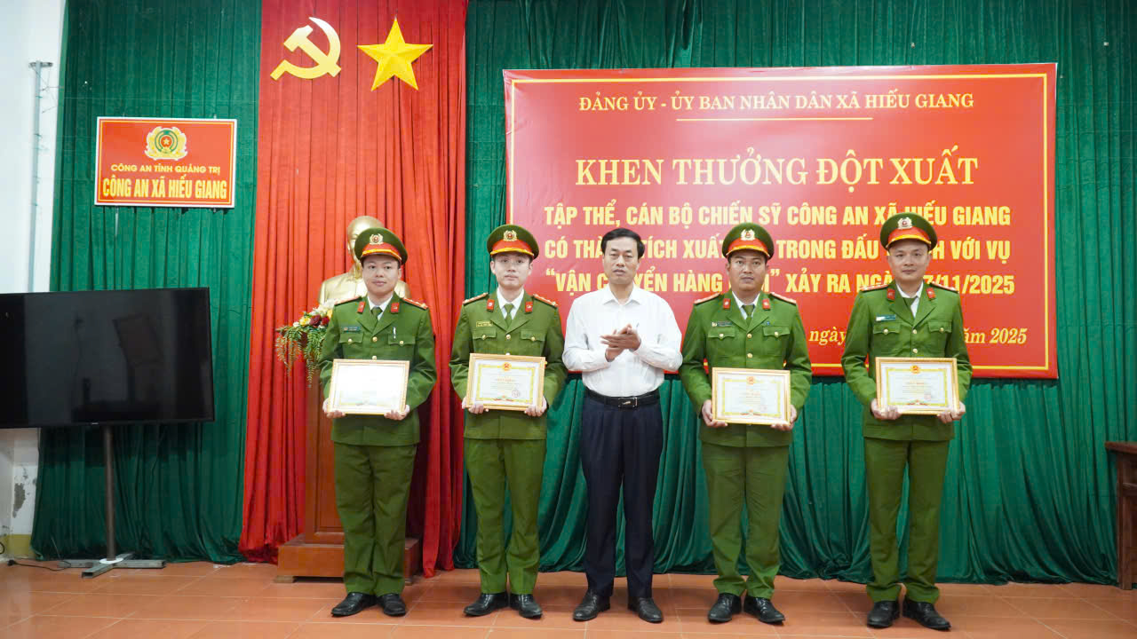 Chiều 5/12/2025, Đảng ủy - UBND xã Hiếu Giang đã tổ chức khen thưởng đột xuất cho tập thể, cán bộ, chiến sĩ Công an xã Hiếu Giang có thành tích xuất sắc trong đấu tranh vụ “vận chuyển hàng cấm” xảy ra ngày 27/11/2025 tại thôn Nam Hiếu, xã Hiếu Giang. Dự buổi khen thưởng có đồng chí Nguyễn Thị Thanh Hương, Bí thư Đảng ủy, Chủ tịch HĐND xã; đồng chí Nguyễn Thanh Bắc, Phó Bí thư Đảng ủy, Chủ tịch UBND xã.
