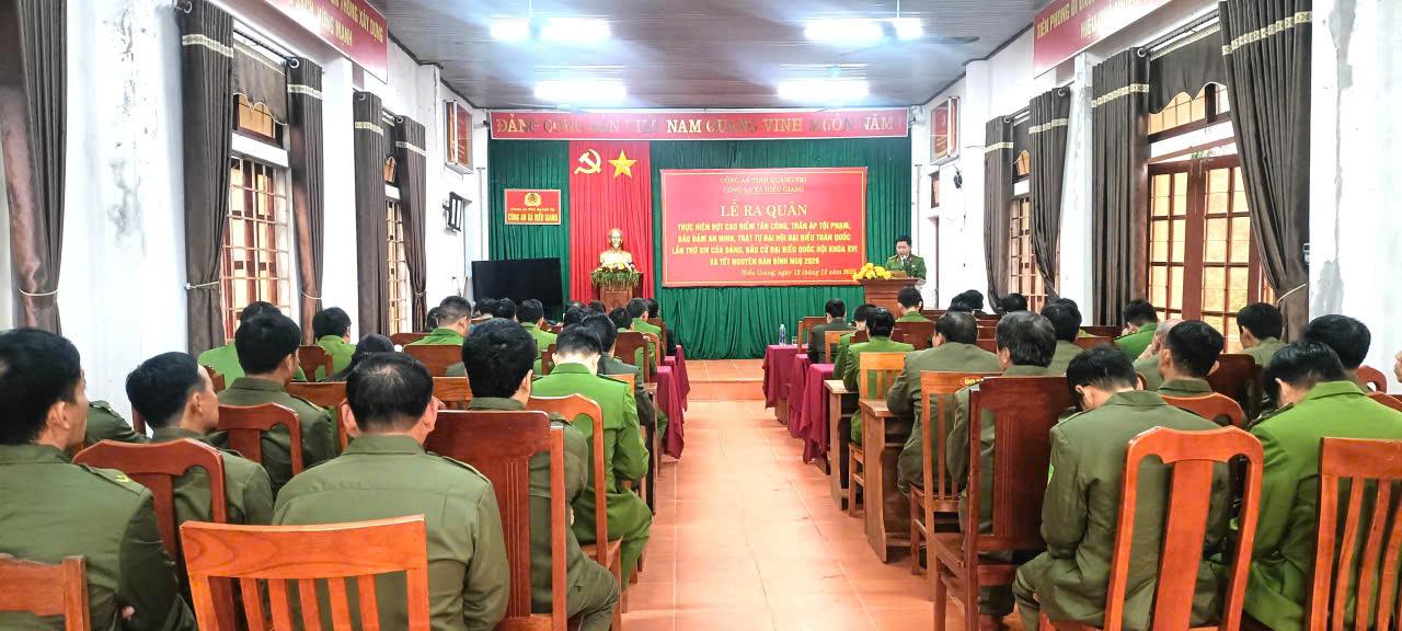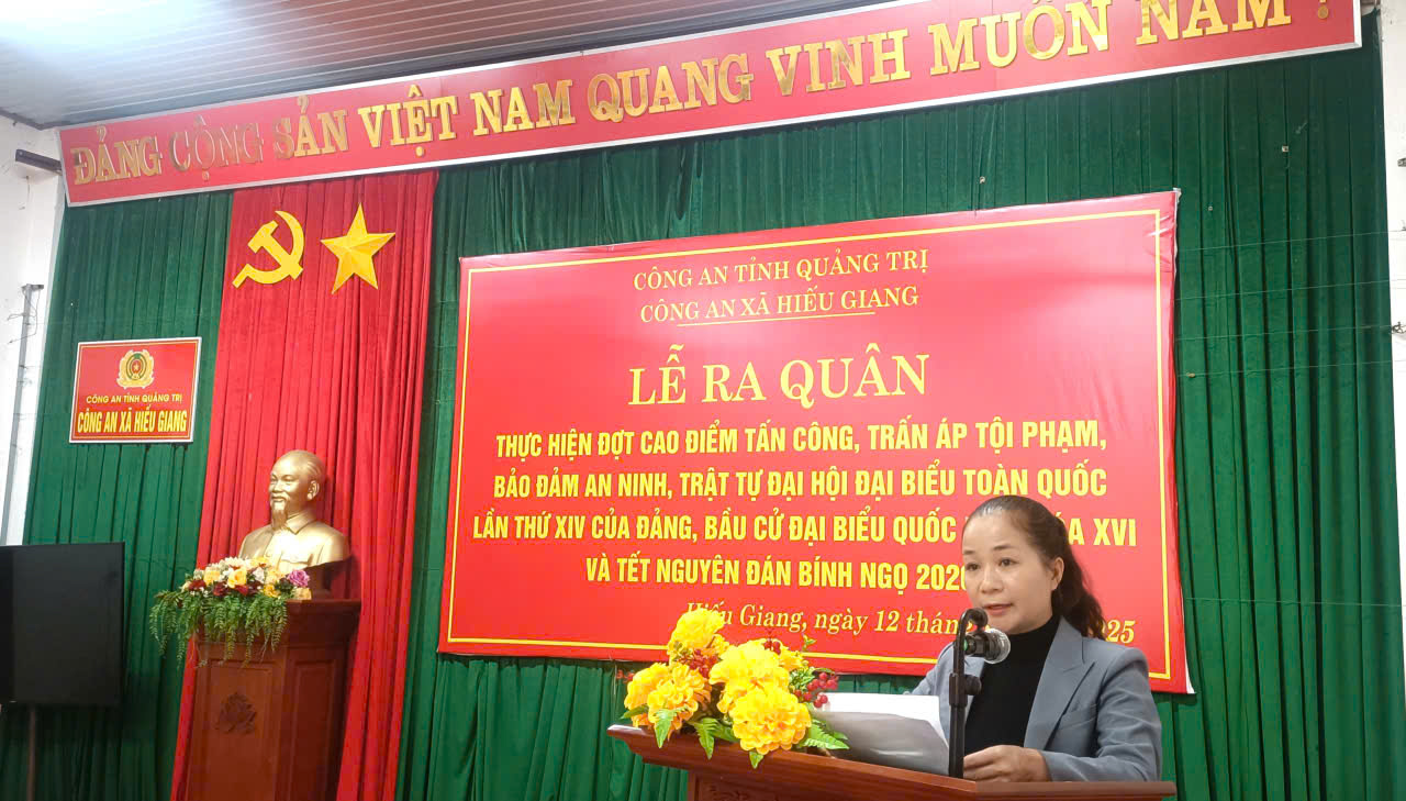 Phát biểu tại lễ ra quân, đồng chí Nguyễn Diệu Hoàng, Ủy viên BTV Đảng ủy, Phó Chủ tịch UBND xã nhấn mạnh tầm quan trọng của công tác bảo đảm an ninh trật tự trong giai đoạn trước, trong và sau Đại hội đại biểu toàn quốc của Đảng, bầu cử Quốc hội và HĐND các cấp, cũng như trong dịp Tết Nguyên đán sắp tới. Đồng chí đề nghị lực lượng Công an cũng như các lực lượng chức năng trên địa bàn xã nêu cao tinh thần trách nhiệm, tăng cường đoàn kết, chủ động phòng ngừa, kiên quyết đấu tranh, trấn áp các loại tội phạm, góp phần bảo đảm an toàn tuyệt đối cho các sự kiện chính trị – xã hội quan trọng của xã Hiếu Giang nói riêng, tỉnh Quảng Trị nói chung.