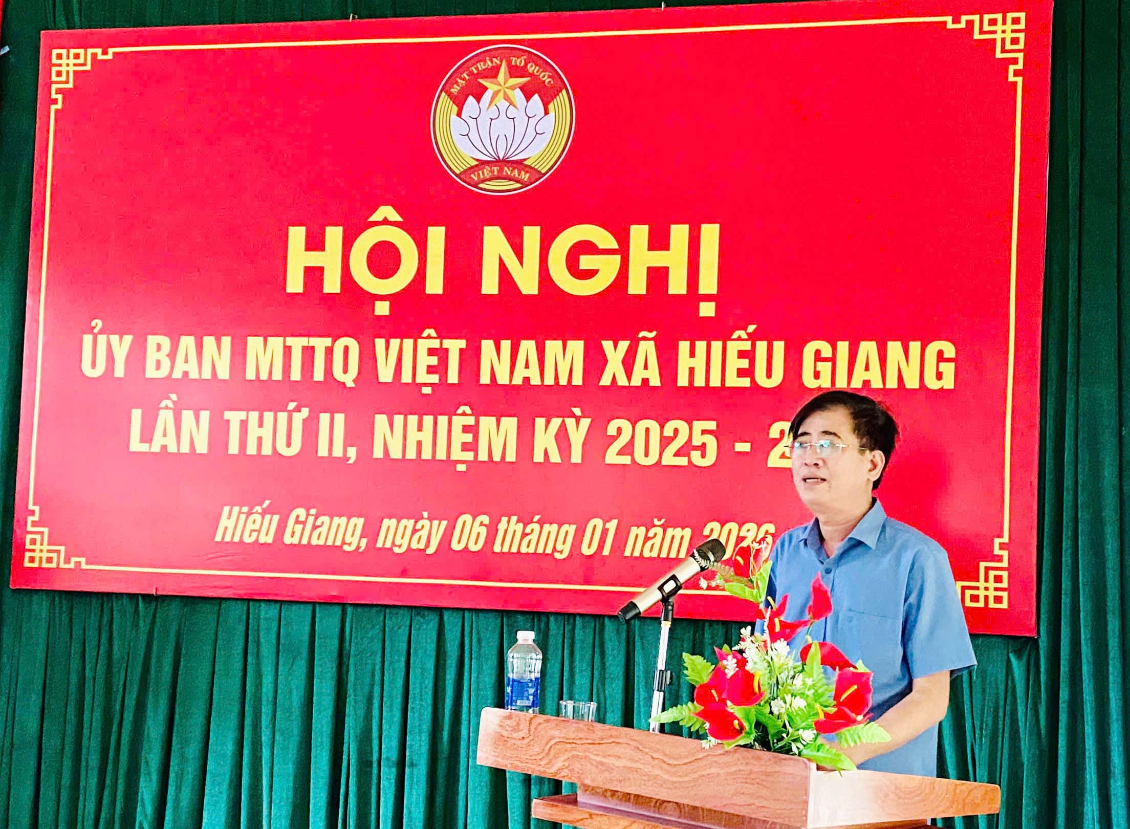 Sáng nay 6/1/2026, Ủy ban MTTQ Việt Nam xã Hiếu Giang tổ chức hội nghị lần thứ II, nhiệm kỳ 2025-2030 nhằm tổng kết công tác Mặt trận năm 2025; triển khai chương trình phối hợp, thống nhất hành động năm 2026. Dự hội nghị có đồng chí Trần Vũ Minh, Phó Bí thư Thường trực Đảng ủy xã; đồng chí Nguyễn Thanh Bình, UVBTV Đảng ủy, Chủ tịch Ủy ban MTTQVN xã cùng các đồng chí ủy viên Ủy ban MTTQ xã và đại diện các tổ chức chính trị - xã hội.