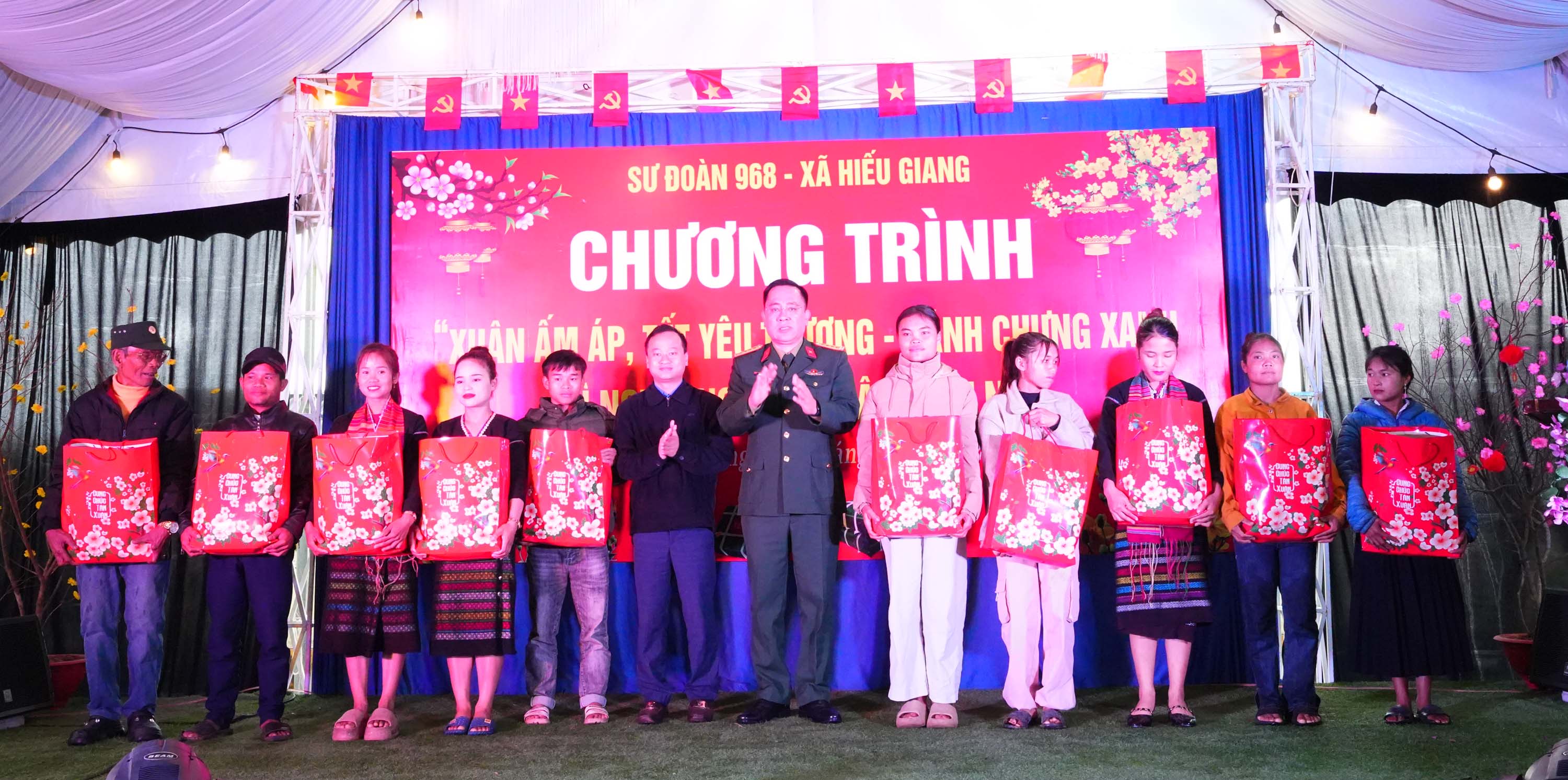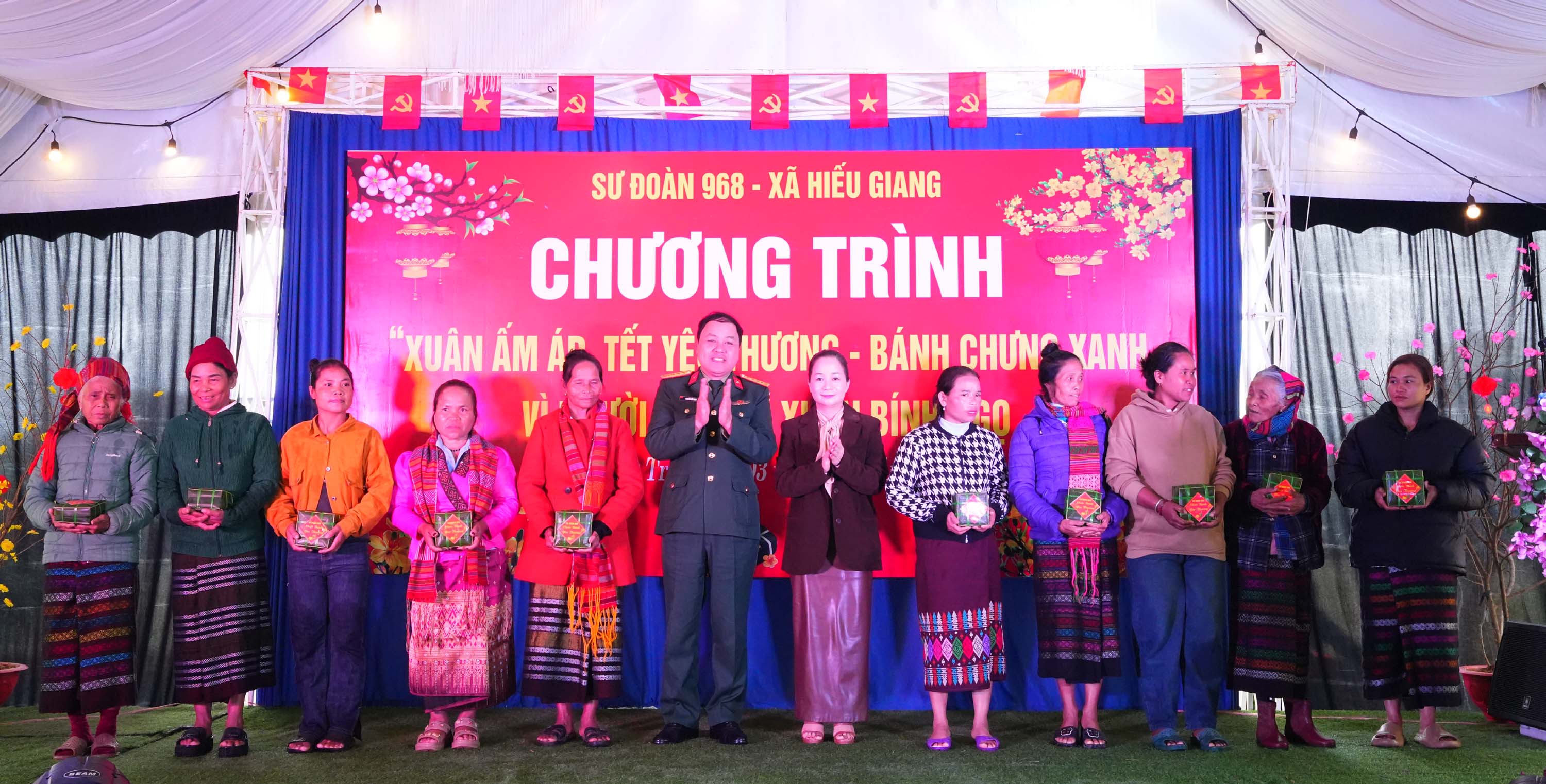 Ngày 3/2/2026, UBND xã Hiếu Giang phối hợp với Sư đoàn 968 tổ chức chương trình “Xuân ấm áp, Tết yêu thương - Bánh chưng xanh vì người nghèo” tại thôn Bản Chùa. Dự chương trình có các đồng chí: Đại tá Đặng Quyết Thắng, Bí thư Đảng ủy, Chính ủy Sư đoàn; Nguyễn Chính Triều, Ủy viên BTV Đảng ủy, Phó Chính ủy Sư đoàn; Nguyễn Quốc Toản, Phó Bí Thư Tỉnh đoàn, Chủ tịch Hội Liên hiệp thanh niên Việt Nam tỉnh. Về phía lãnh đạo địa phương có đồng chí Nguyễn Thanh Bình, UVBTV Đảng ủy, Chủ tịch Ủy ban MTTQVN xã; đồng chí Nguyễn Diệu Hoàng, Ủy viên BTV Đảng ủy, Phó Chủ tịch UBND xã.