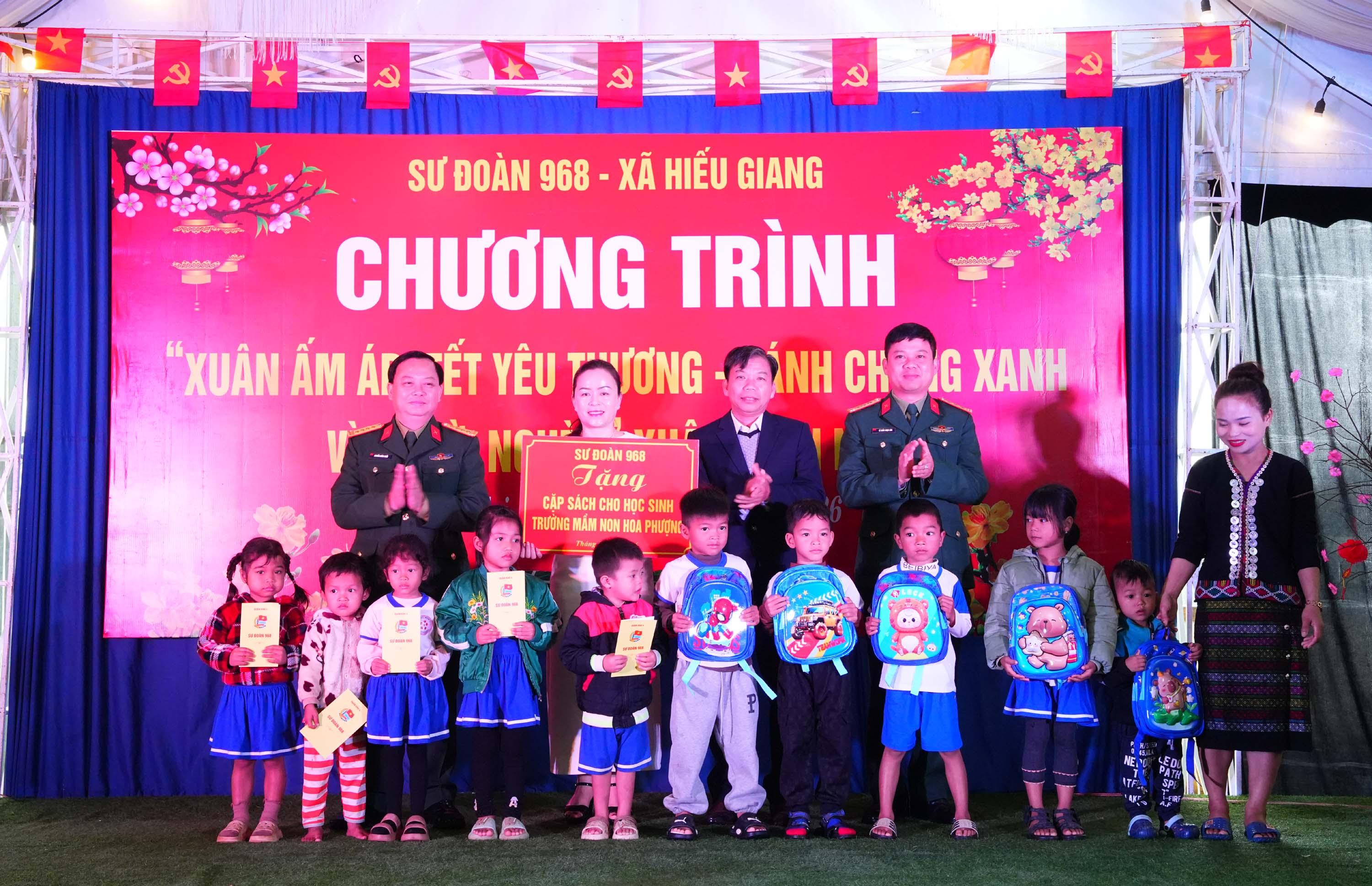 Lãnh đạo xã Hiếu Giang và Sư đoàn 968 trao quà cho các em học sinh có hoàn cảnh đặc biệt khó khăn