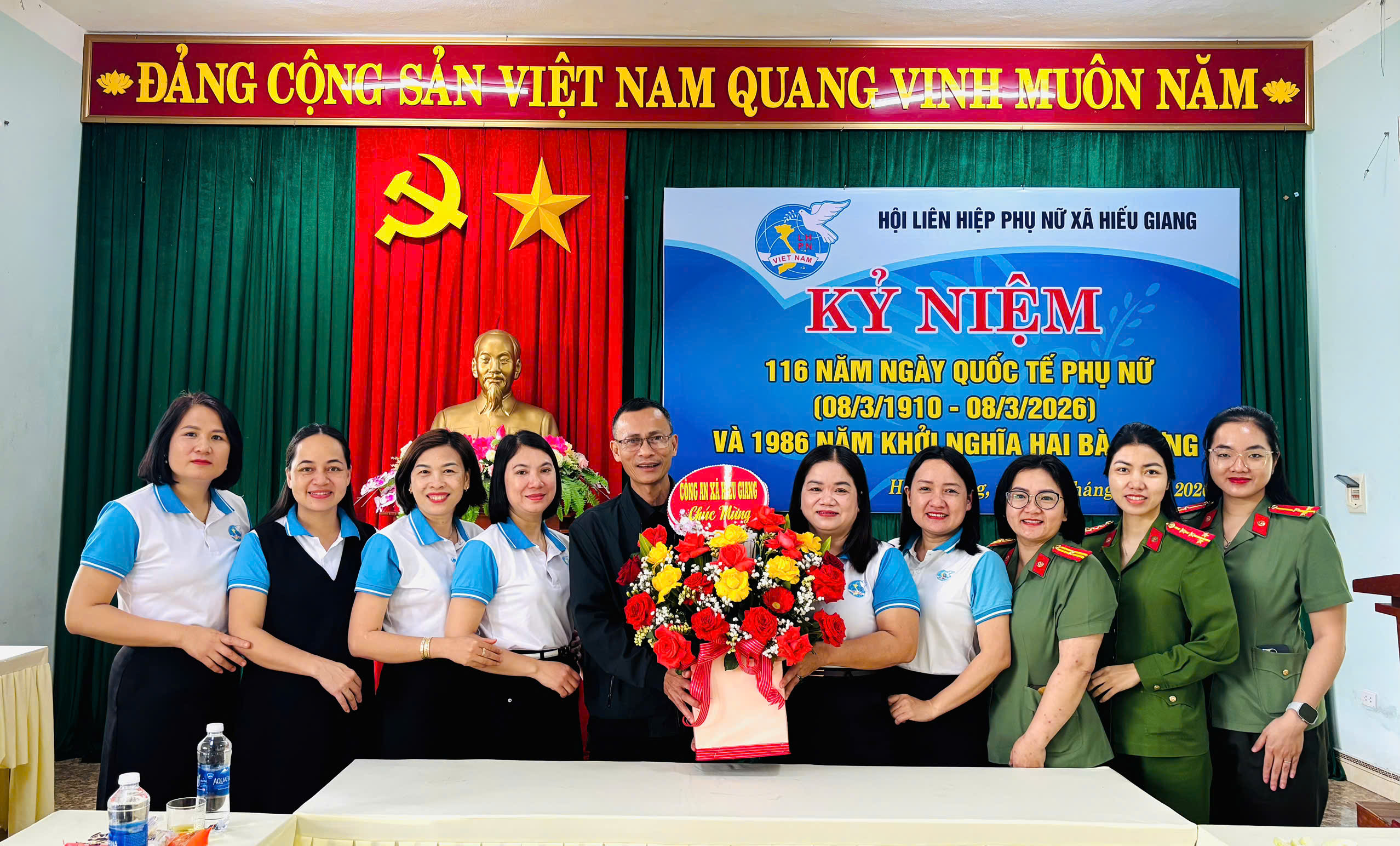 Tặng hoa, chúc mừng cán bộ Hội Liên hiệp Phụ nữ xã, đồng chí Trần Vũ Minh, Phó Bí thư Thường trực Đảng ủy xã ghi nhận và đánh giá cao những đóng góp của các cấp hội phụ nữ trong công tác xây dựng Đảng, phát triển kinh tế - xã hội của xã nhà, đặc biệt là tập hợp hội viên, giúp phụ nữ xóa đói, giảm nghèo, xây dựng nông thôn mới; có nhiều cách làm hay, sáng tạo trong các phong trào thi đua như “Phụ nữ tích cực học tập, lao động sáng tạo, xây dựng gia đình hạnh phúc”; “Giỏi việc nước, đảm việc nhà”; “xây dựng gia đình 5 không, 3 sạch”…