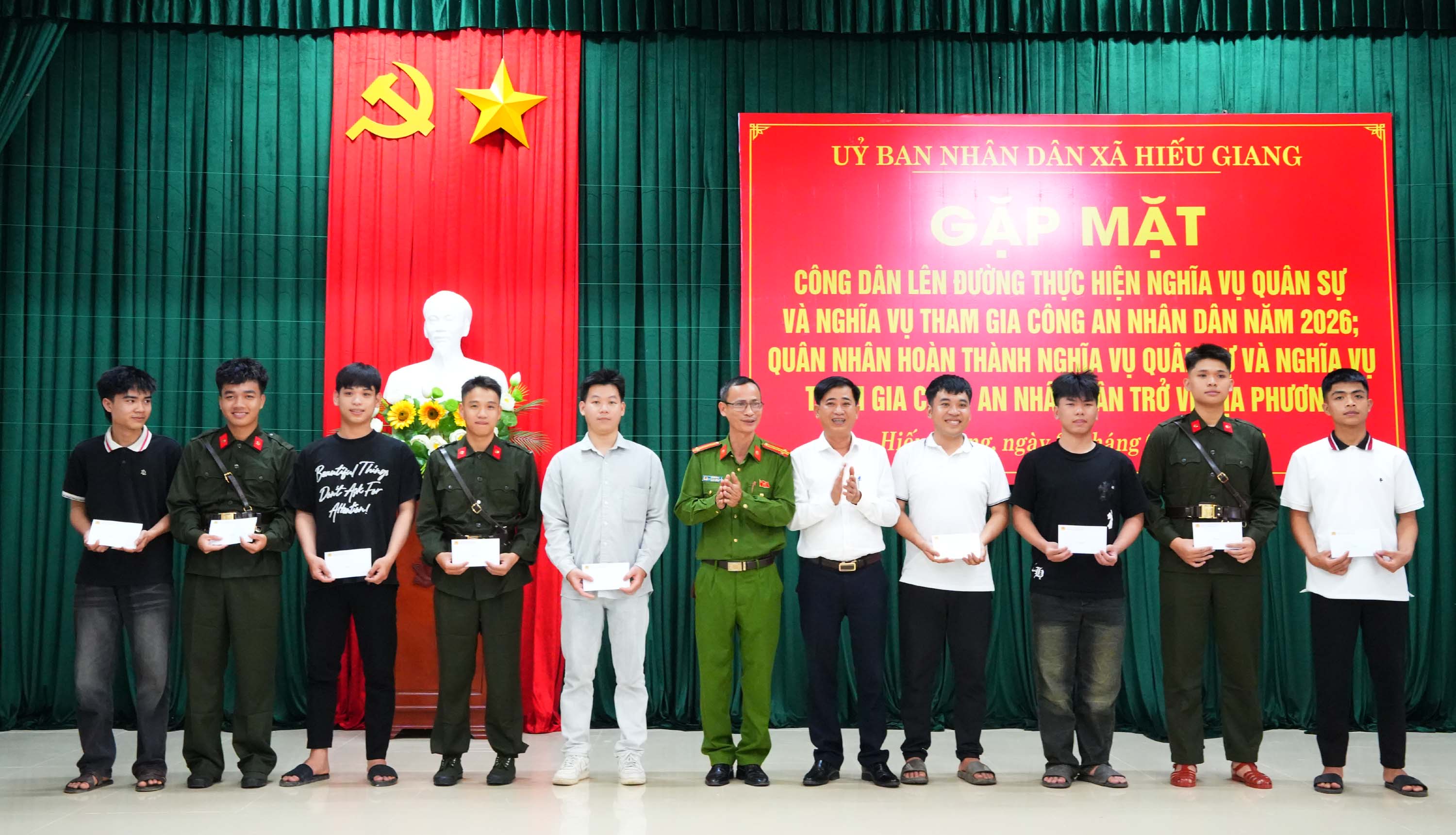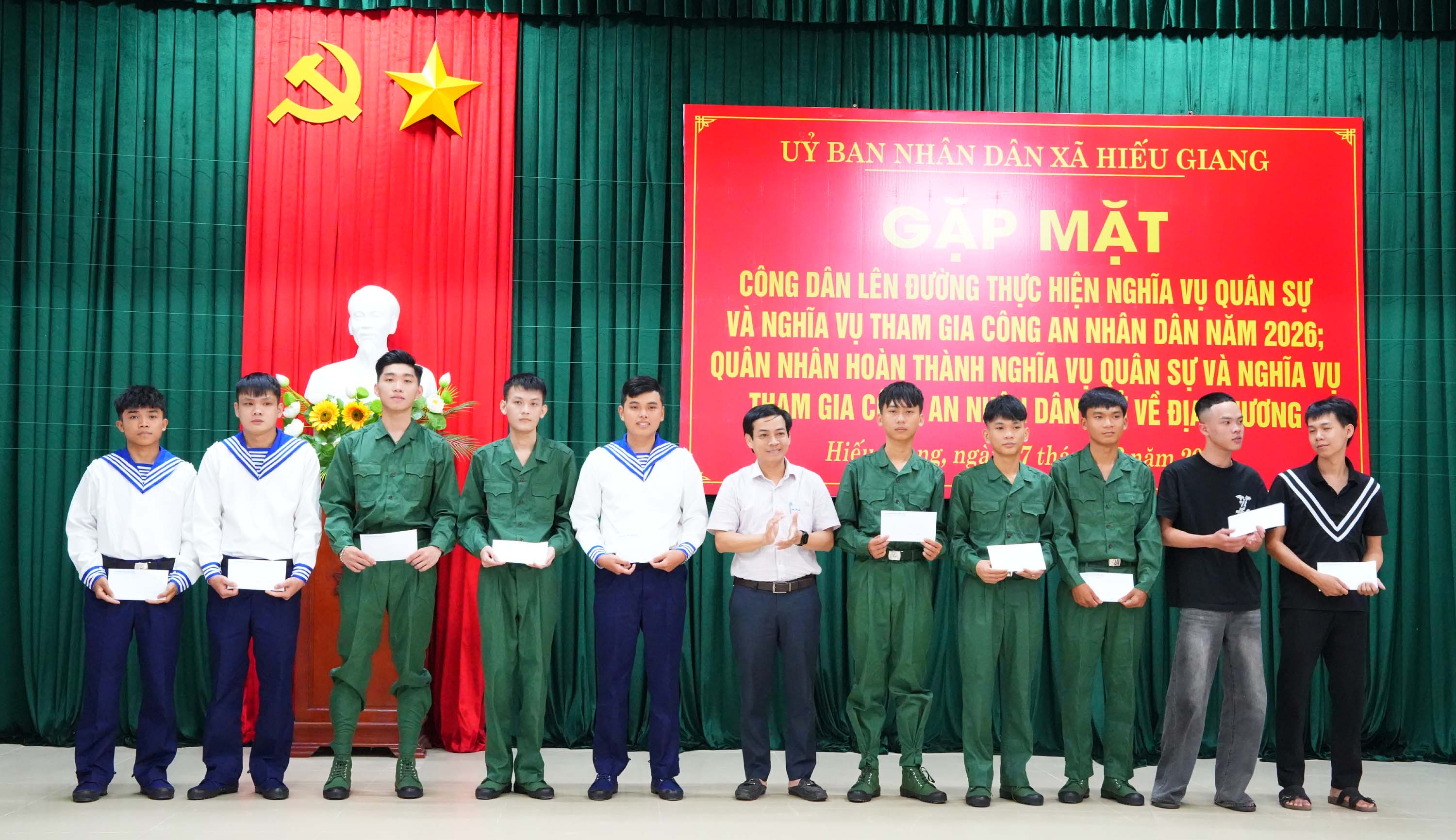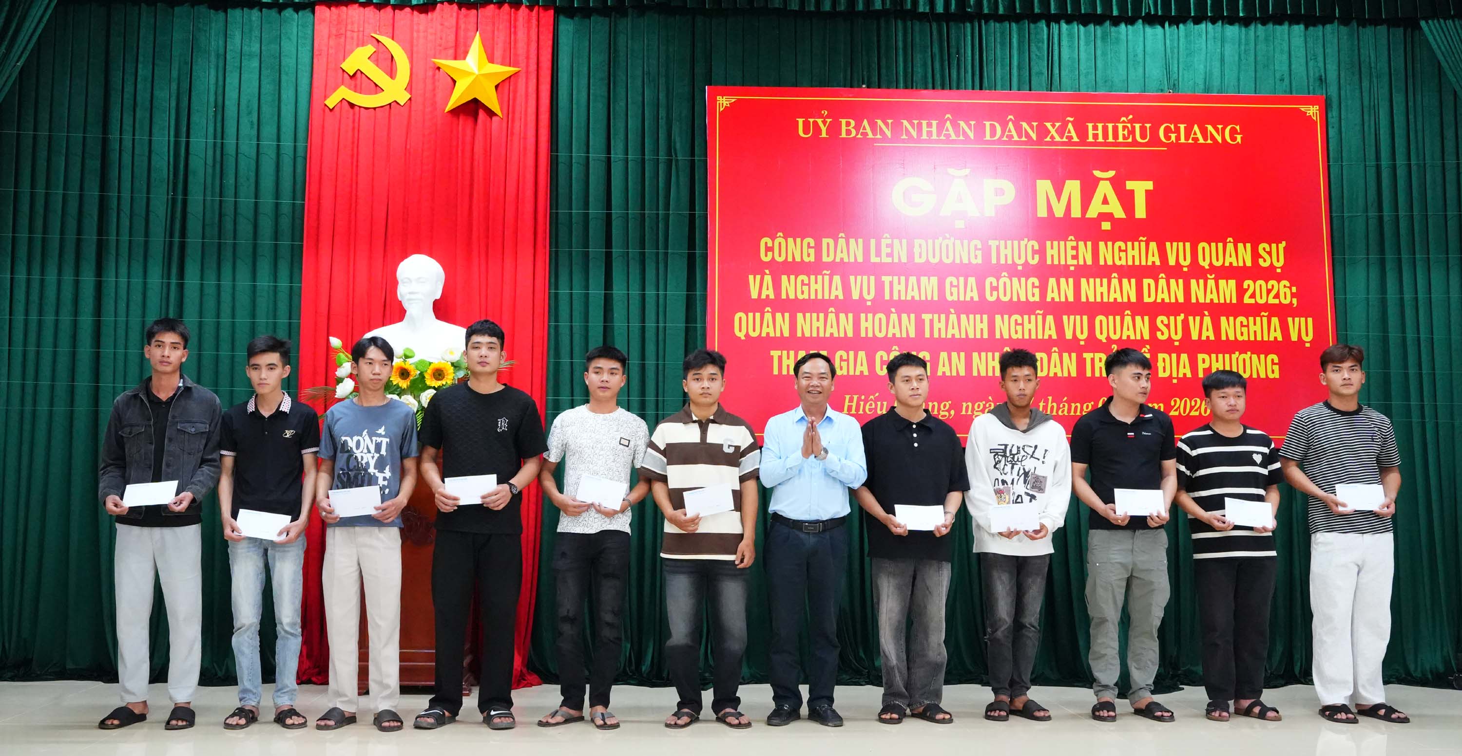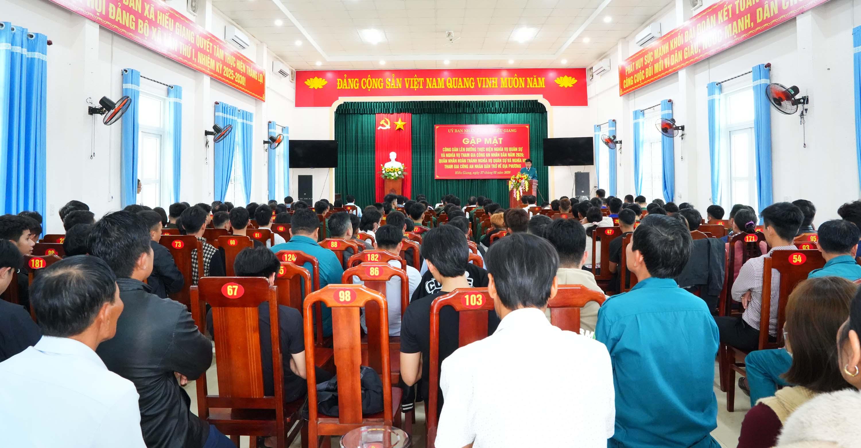 Chiều 27/2/2026, xã Hiếu Giang tổ chức gặp mặt, tặng quà, động viên các công dân lên đường thực hiện nghĩa vụ quân sự, nghĩa vụ Công an nhân dân năm 2026 và quân nhân hoàn thành nghĩa vụ quân sự, nghĩa vụ Công an nhân dân trở về địa phương. Dự buổi gặp mặt có đồng chí Trần Vũ Minh, Phó Bí thư Thường trực Đảng ủy xã; đồng chí Nguyễn Thanh Bình, UVBTV Đảng ủy, Chủ tịch Ủy ban MTTQVN xã cùng các đồng chí trong Thường trực Đảng ủy, HĐND, UBND, Ủy ban MTTQ Việt Nam xã.