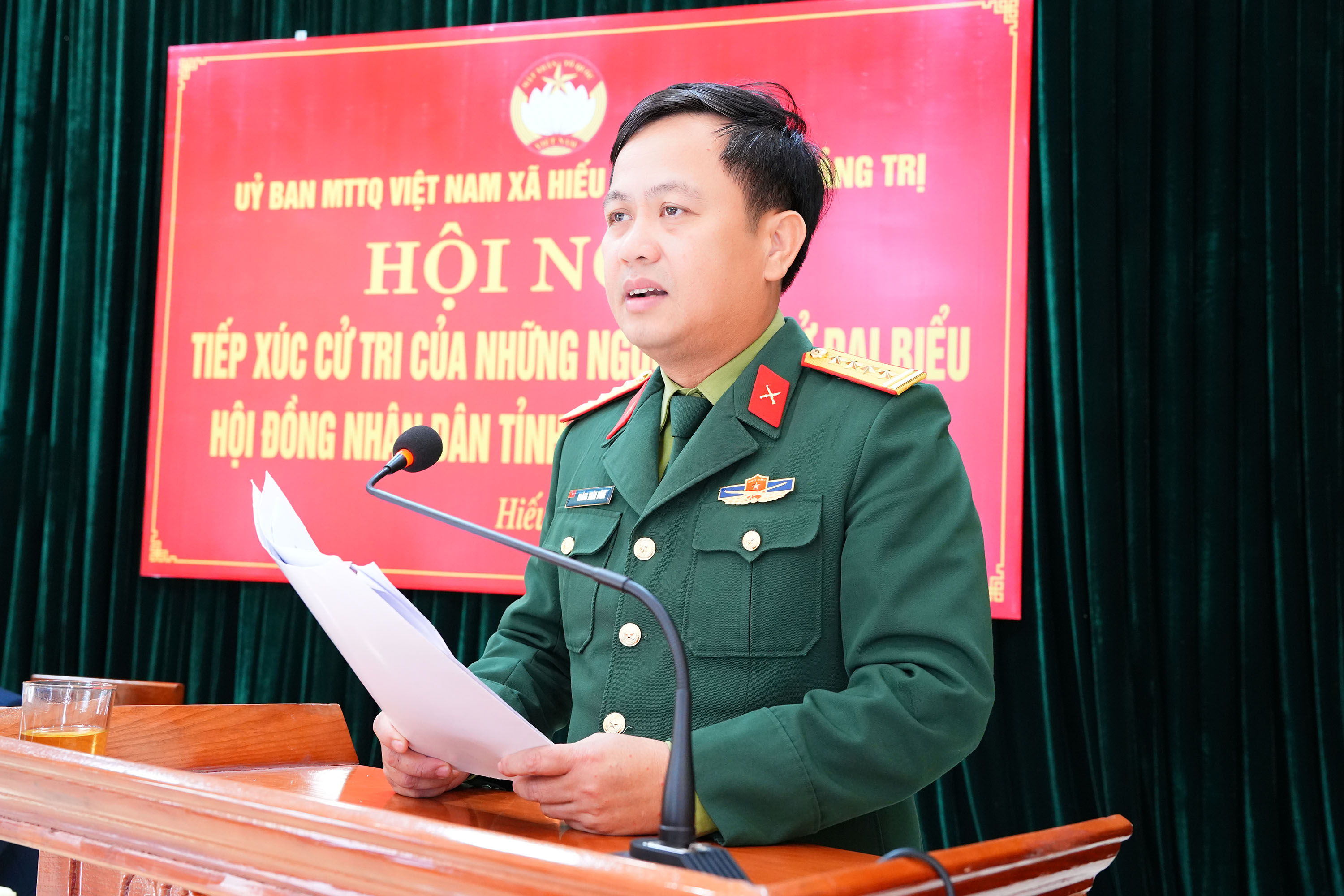 Dự hội nghị có đồng chí Thượng tá Hồ Công Sơn, Phó Chủ nhiệm Chính trị Bộ Chỉ huy Quân sự tỉnh. Quảng Trị. Về phía lãnh đạo địa phương có đồng chí Nguyễn Thị Thanh Hương, Bí thư Đảng ủy, Chủ tịch HĐND xã cùng các đồng chí trong Thường trực Đảng ủy, HĐND, UBND, Ủy ban MTTQ Việt Nam xã và đông đảo cử tri xã Hiếu Giang.