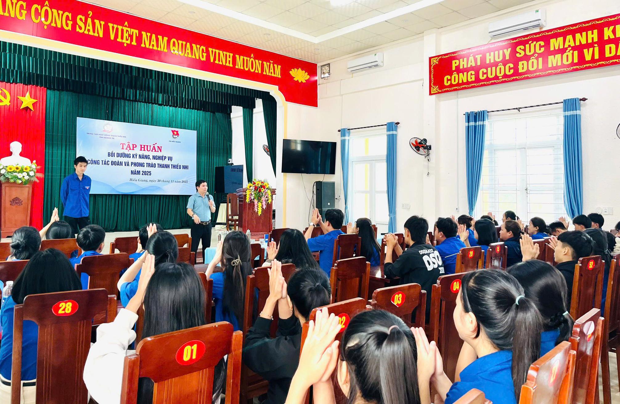 Ngày 30/11/2025, Ban Thường vụ Đoàn xã Hiếu Giang phối hợp với Trung tâm hoạt động Thanh thiếu nhi tỉnh Quảng Trị tổ chức lớp tập huấn bồi dưỡng kỹ năng, nghiệp vụ công tác Đoàn và phong trào Thanh thiếu nhi năm 2025 cho đội ngũ Ban Chấp hành Đoàn xã; Bí thư, Phó Bí thư các cơ sở Đoàn trực thuộc và đoàn viên, thanh niên trên địa bàn xã.