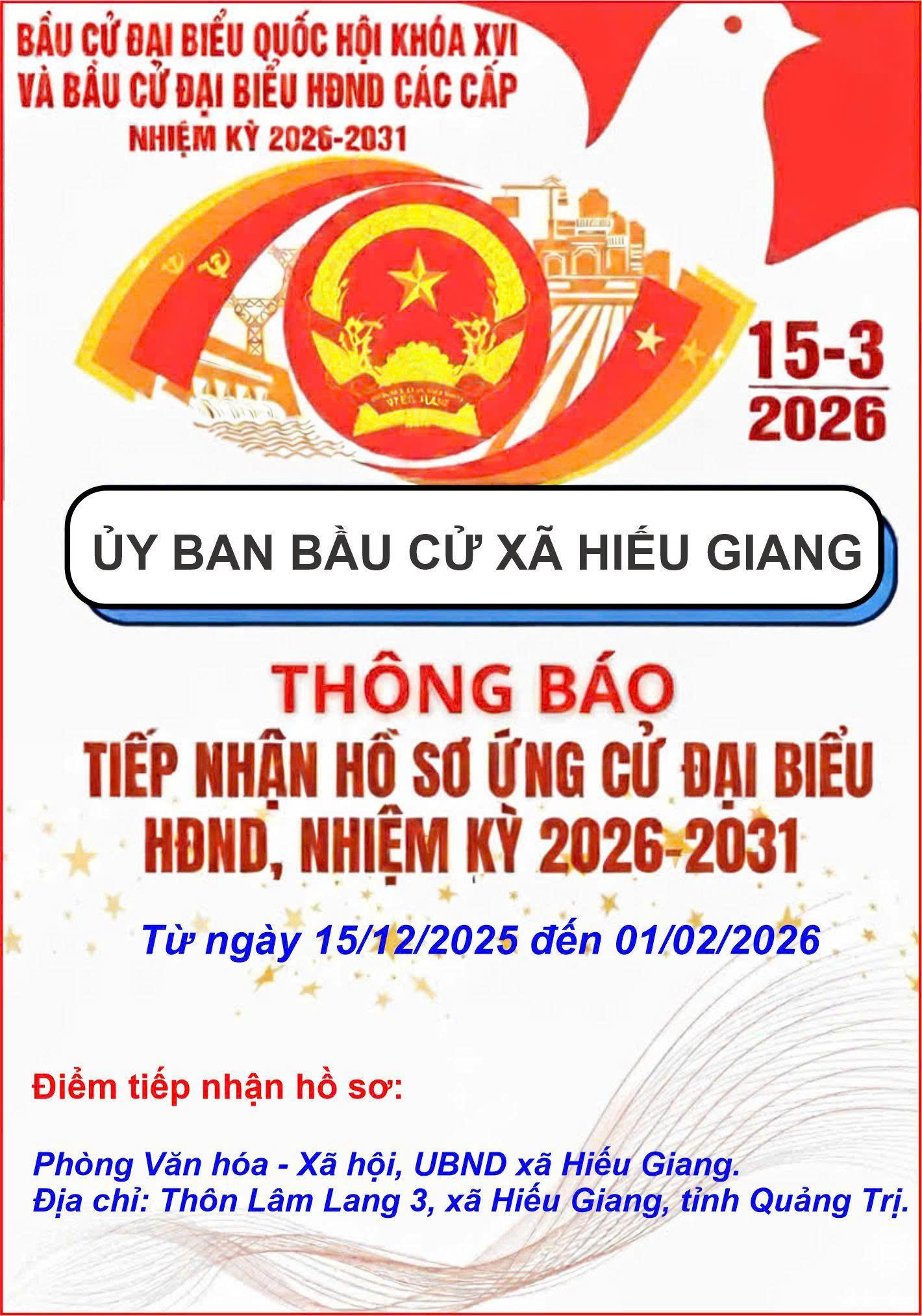 Hiện nay, Phòng Văn hóa – Xã hội thuộc UBND xã Hiếu Giang đã và đang tích cực tiếp nhận hồ sơ ứng cử đại biểu HĐND xã, nhiệm kỳ 2026-2031. Người ứng cử nộp hồ sơ trực tiếp tại Phòng Văn hóa – Xã hội đến 17 giờ 00 phút ngày 1/2/2026. Việc nộp hồ sơ đúng thời hạn là điều kiện bắt buộc để xem xét đưa vào danh sách người ứng cử theo luật định.