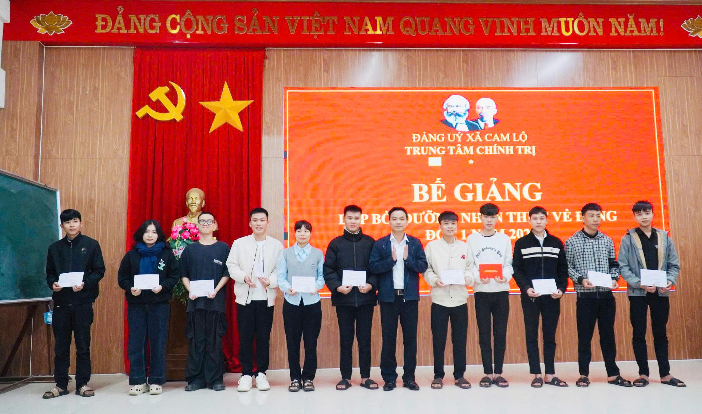Ngày 23/1/2026, Trung tâm Chính trị xã Cam Lộ tổ chức lễ bế giảng lớp bồi dưỡng nhận thức về Đảng đợt 1 năm 2026 cho 46 học viên đến từ hai xã Hiếu Giang và Cam Lộ. Tham dự lễ bế giảng có đồng chí Nguyễn Thị Hoàng Oanh, Phó Bí thư Thường trực Đảng ủy xã Cam Lộ; đồng chí Phạm Văn Bình, UVBTV Đảng ủy, Trưởng Ban Xây dựng Đảng xã Hiếu Giang; đồng chí Trần Trung Nguyên, Đảng ủy viên, Phó Trưởng Ban Xây dựng Đảng xã Cam Lộ.
